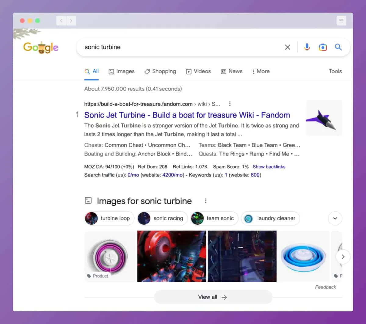 By calling my company Sonic Turbine, I’d add more specificity to the search term. Looking at the Google results for “sonic turbine,” I see a handful of images and a random page on Fandom. This search term should be easy to rank in the top spot.