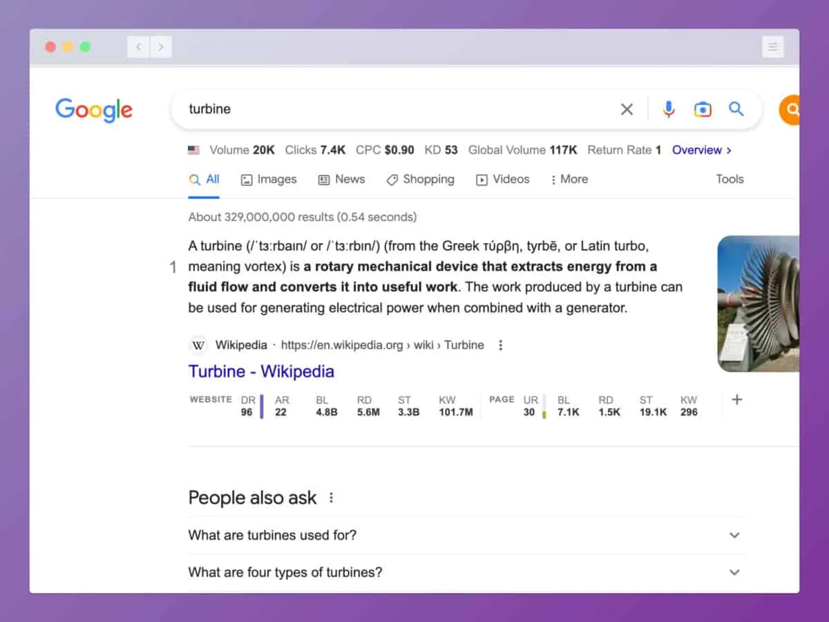 We must dig deeper if the first result is a Wikipedia page. Using our “turbine” example, we’re unlikely to beat Wikipedia from the number one spot. They have a high-ranking article dedicated to turbines.